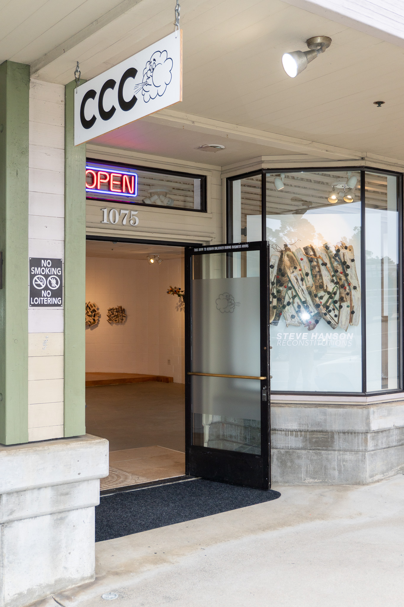 Easy traffic and a few amazing views later, we arrive in downtown Cambria, where we meet up with Charles Smith, owner and curator of Cruise Control Contemporary gallery. The gallery is hosting an exhibition that we have travelled to see — Reconstitutions, new works by Santa Barbara–based artist Steve Hanson.