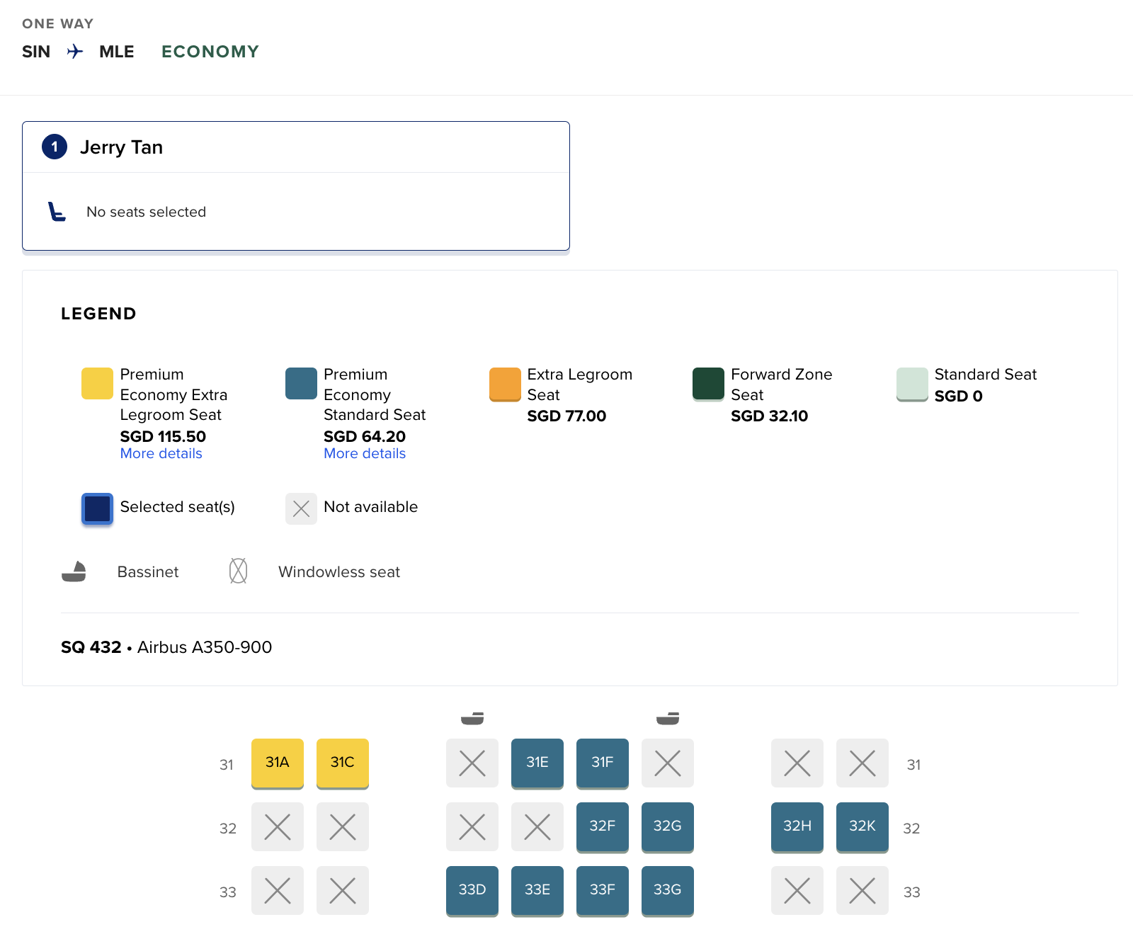Here’s an example for a non-KrisFlyer member reserving a Premium Economy seat from Singapore to Malé on an Airbus A350 Long Haul flight.
