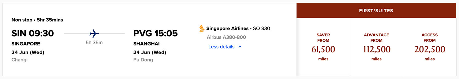 Some dates have Saver Suites award space on the Singapore – Shanghai route